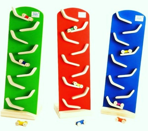 Bajada de autos hecha en mdf y madera de alamo y palo blanco, medida 60x20 cm apróx, trae 3 autitos con ejes de seguridad, 9 rampas y una base.