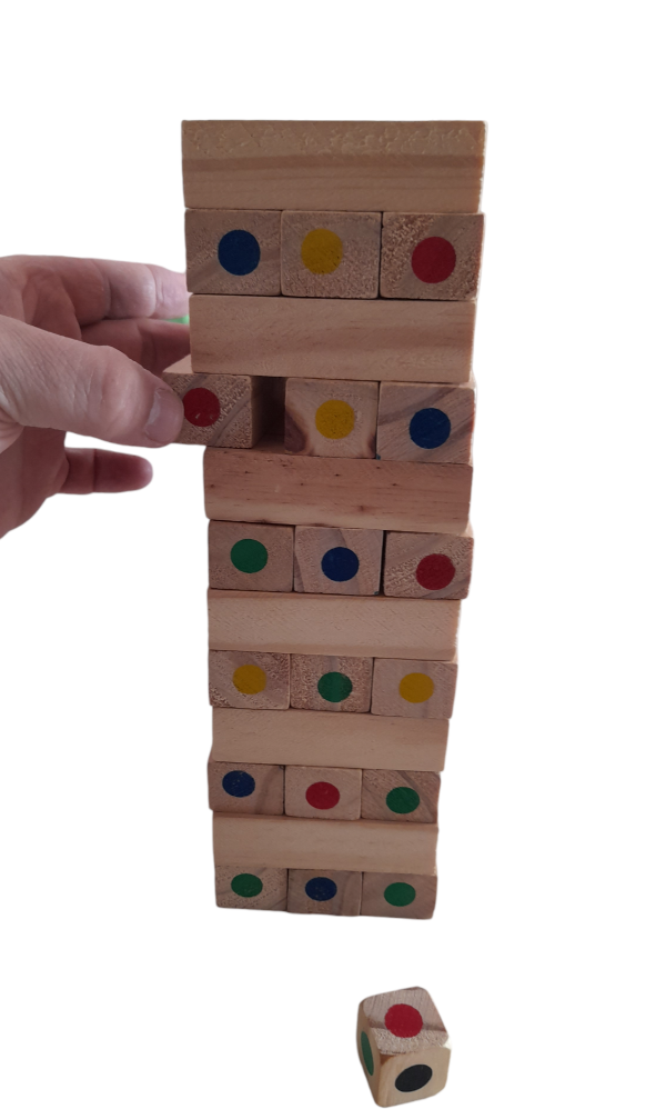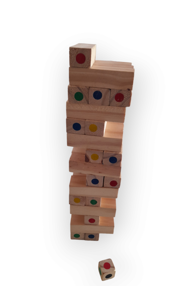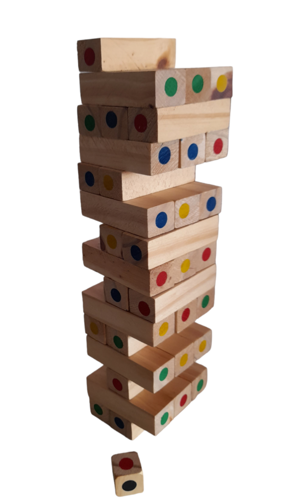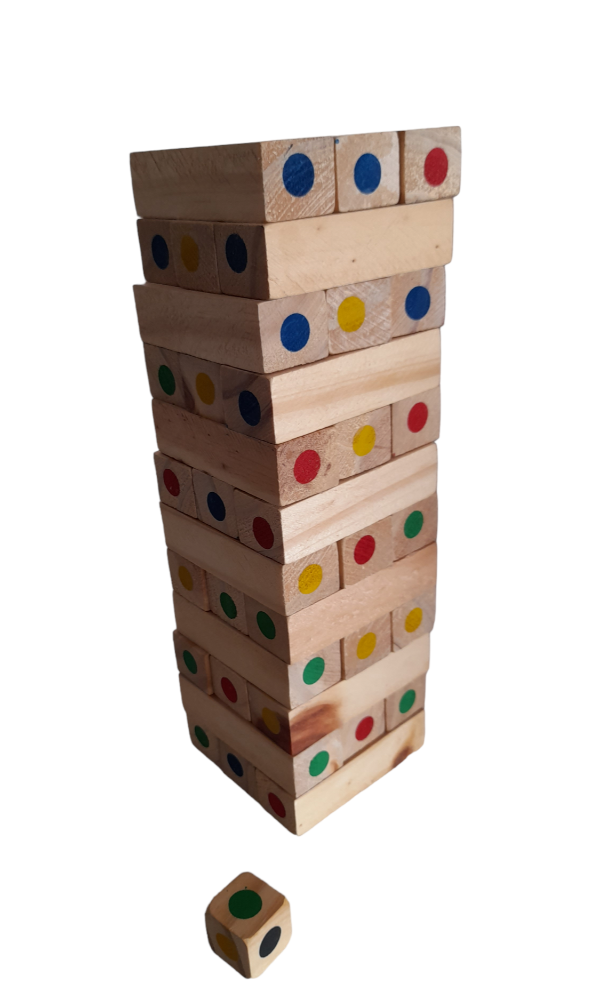 La torre trae 36 tablitas de madera más 1 dado con colores para saber que tabluta deben sacar.