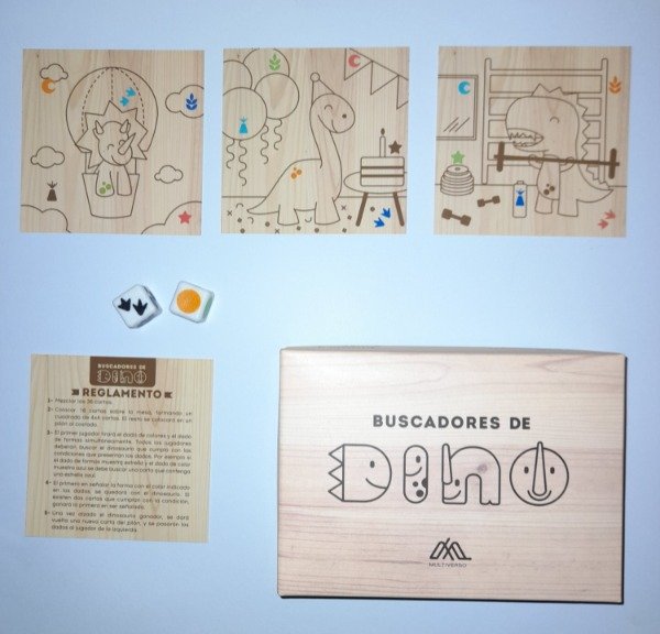 Contiene: 36 cartas de dino, 2 dados, 1 reglamento.