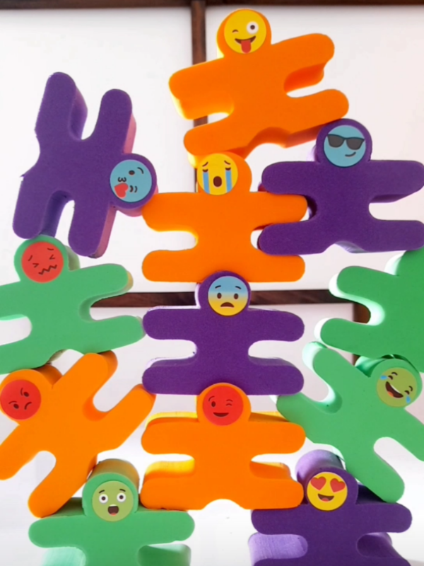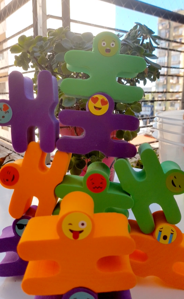 12 piezas de goma eva de 32 mm de espesor, medida 8,5 x 6,5 cm. Incluye plancha con 12 stickers de Emojis para pegar en las figuras.