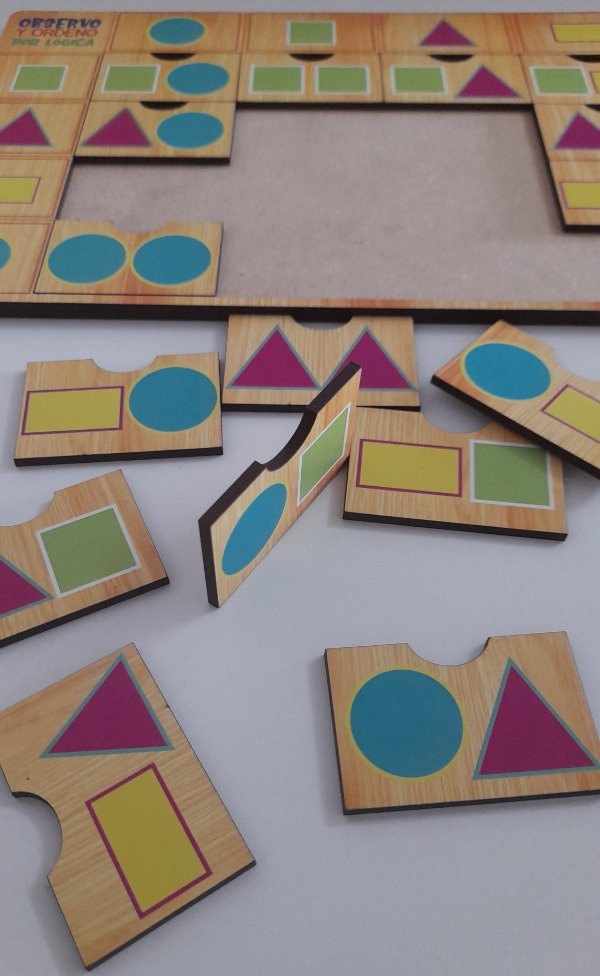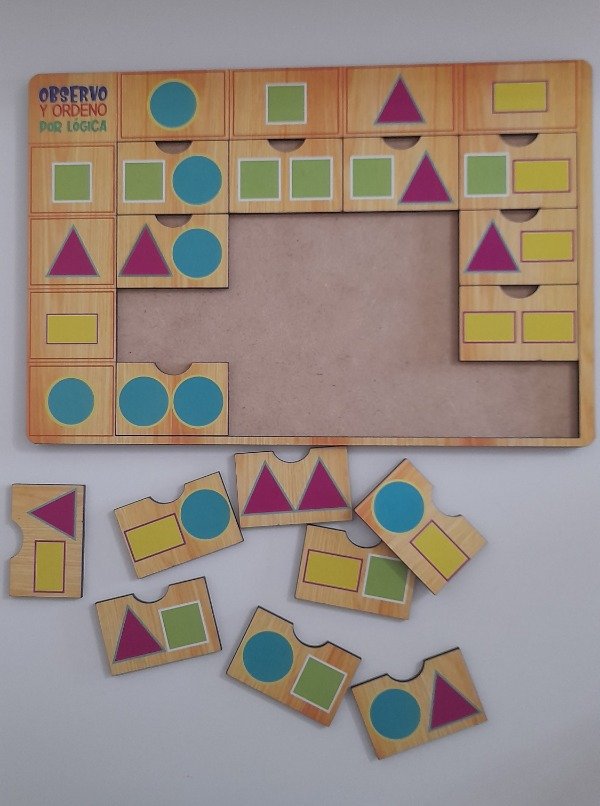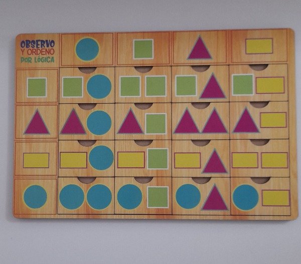 Tablero encastrable de madera de 29x20 cm con 16 fichas para encastrar y ordenar por lógica.