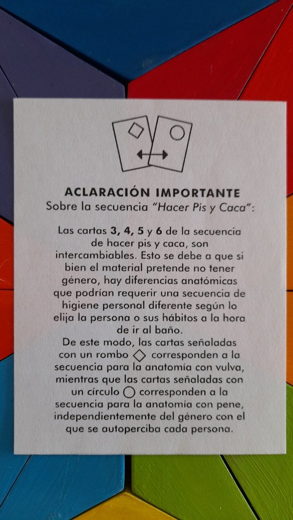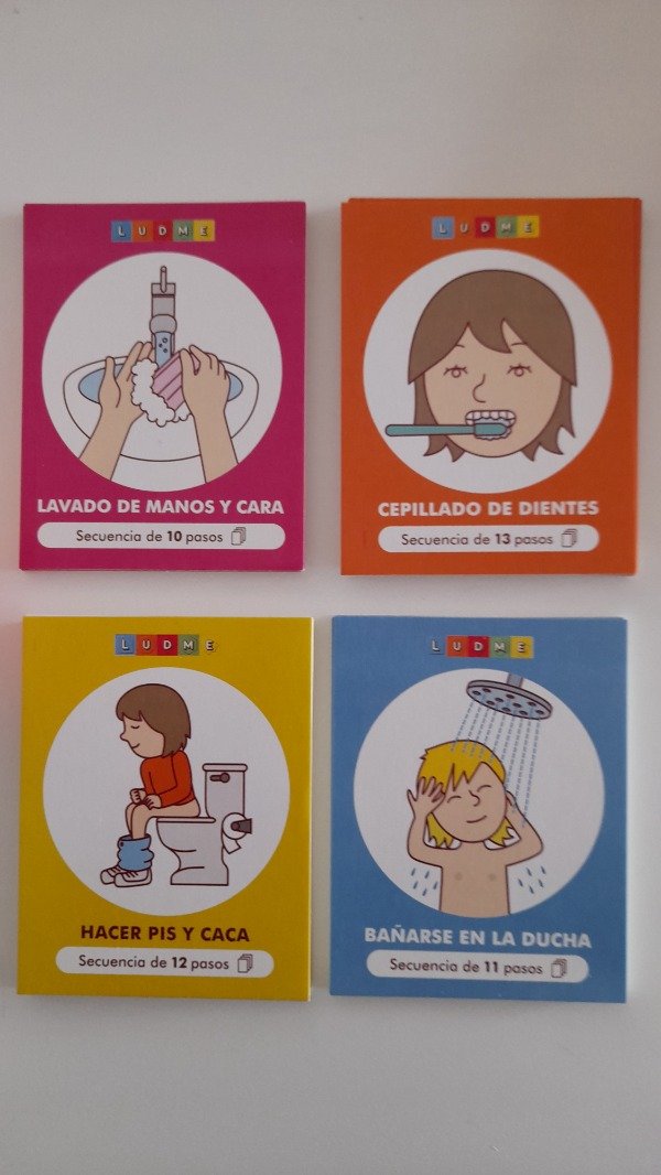 Secuencias de higiene en pictogramas, 50 cartas de 9cm x 12cm, contiene cuatro rutinas de higiene en secuencias paso a paso. Ir al baño pis y caca, Lavado de manos y cara, cepillado de dientes y baño en la ducha.