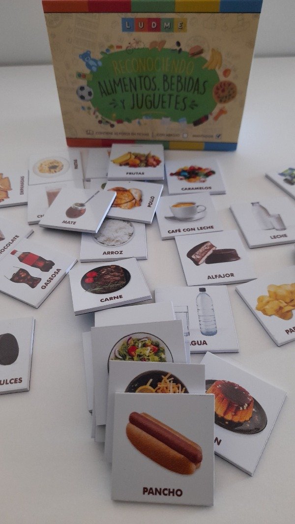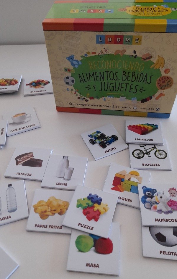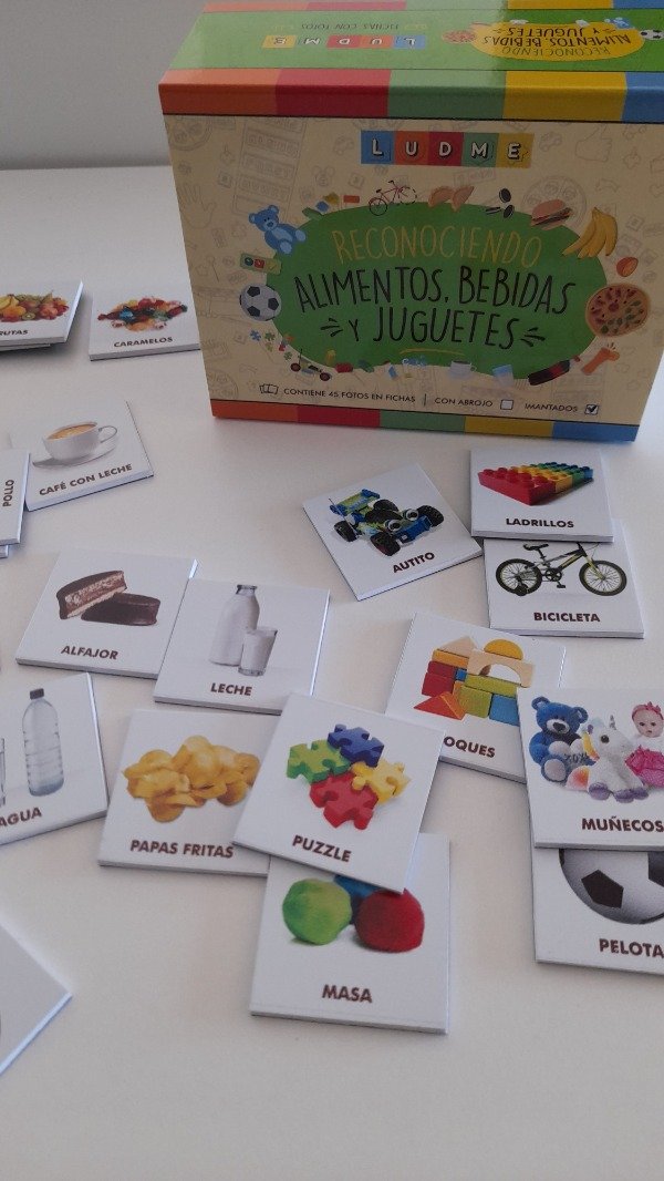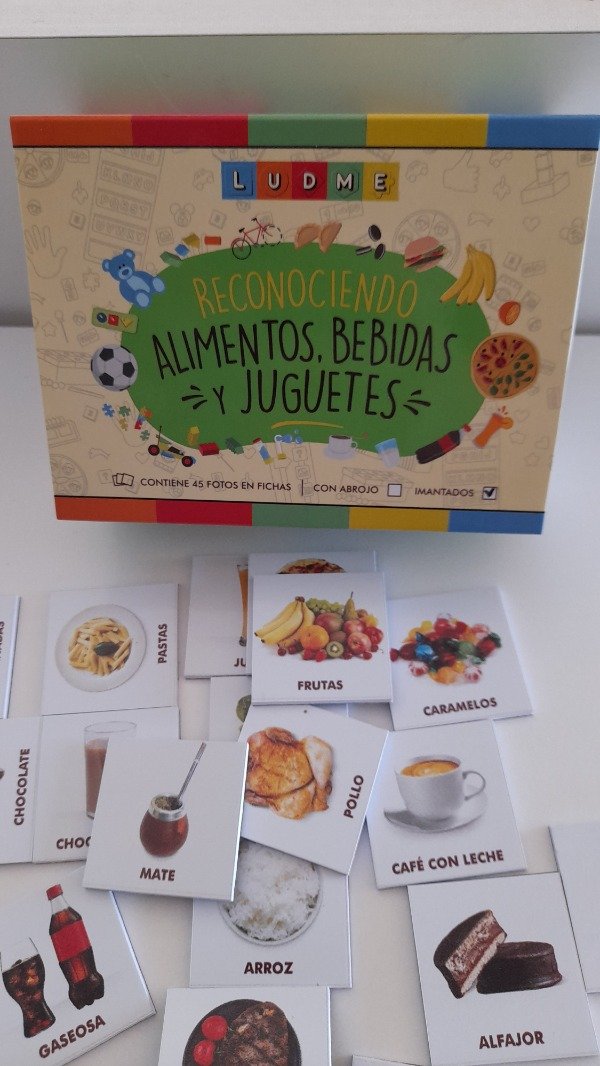 45 fichas de 2mm de espesor con imágenes reales de alimentos, bebidas y juguetes