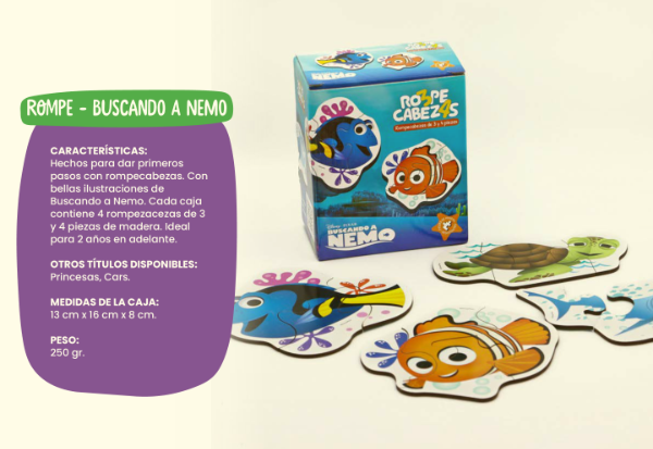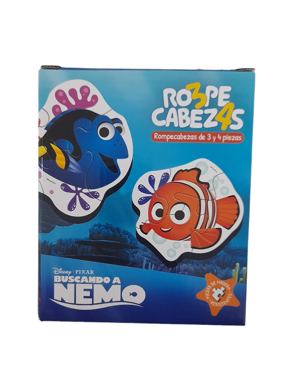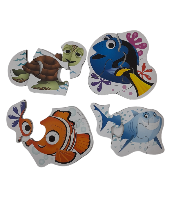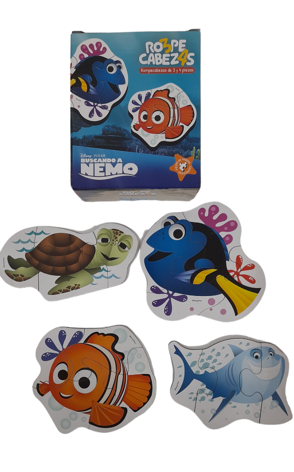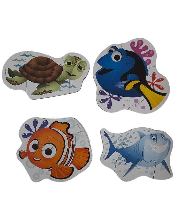 4 rompecabezas de madera de 3 y 4 piezas con bellas ilustraciones de Buscando a Nemo. Ideal para 2 años en adelante.
