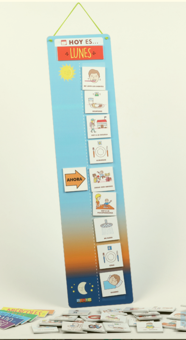 Ésta agenda diaria magnética viene acompañada de 37 pictogramas de 5x5cm imantados para anticipación de las rutinas que van a realizarse en la jornada.