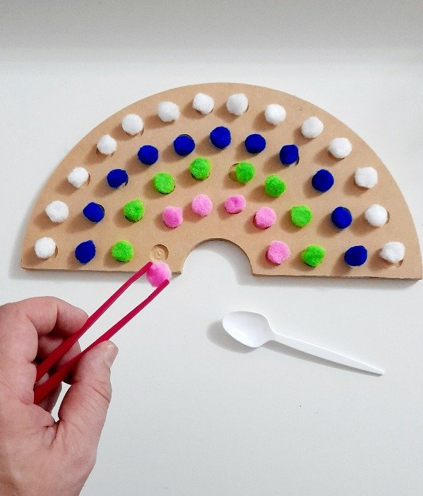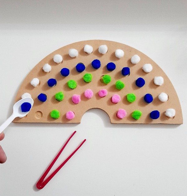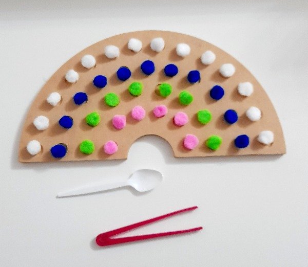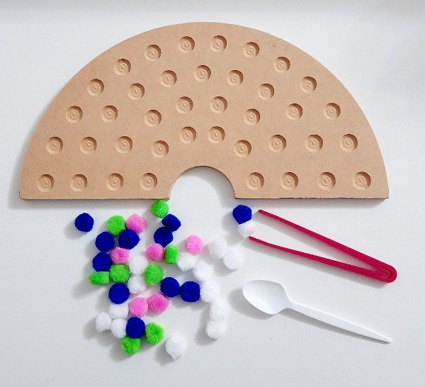 Contiene 1 tablero en mdf en forma de arco iris, 40 pompones de colores, 1 pinza, 1 cuchara.