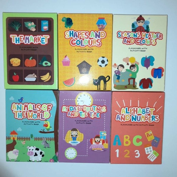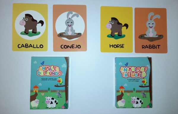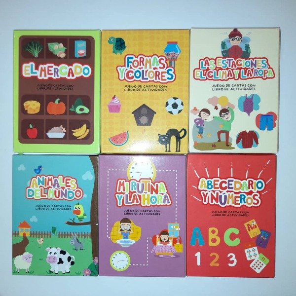 Juegos de cartas con libritos de actividades, cada maso trae 50 cartas laminadas de 12,5cm de alto x 8,5cm de ancho.