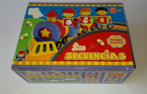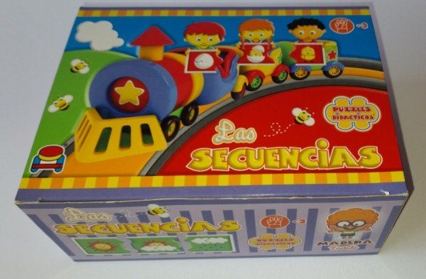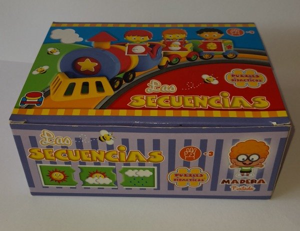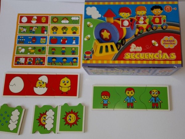 10 Puzzles didácticos de madera pintada, de 18cm x 6cm x 0,3cm.